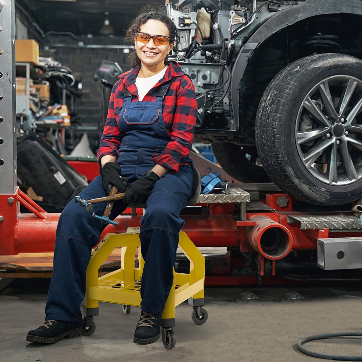 - 【Universal Wheels for Easy Mobility】Navigate around your workspace with utter ease. Equipped with 4 universal wheels, our adjustable swivel garage stool ensures superior mobility across various floor types. The wheels glide smoothly, allowing quick and effortless movement around your garage, workshop or repair shop.