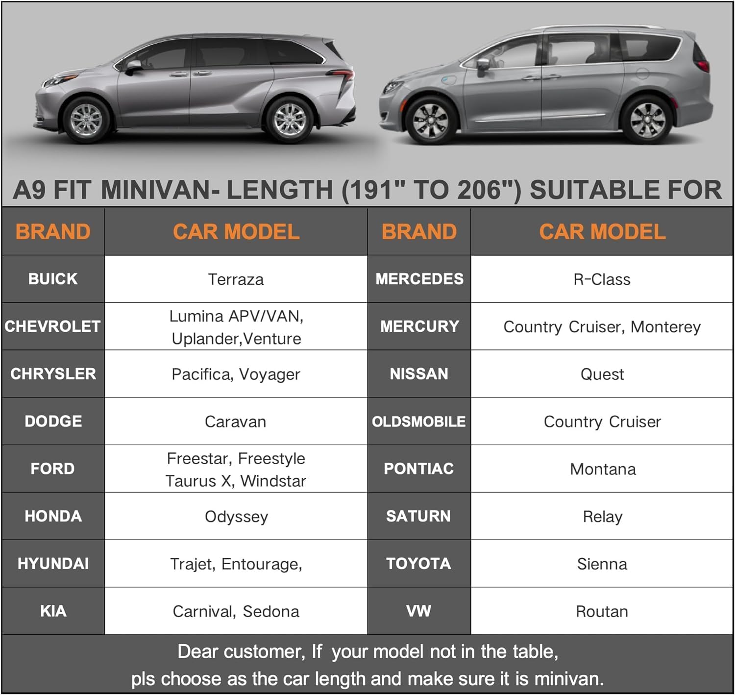 - ăDimension A9ăUniversal fit for Minivan / Station Wagon, MPV which length is 191-206 inch. (NOT FOR SEDAN/SUV). Such as Honda odyssey, Toyota sienna, Chrysler pacifica/town&country/Voyager, Dodge grand caravan, Volvo v90 etc.Come with a large enough and waterproof portable storage pocket to store the cover.