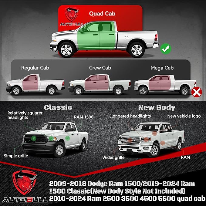 - Fitment:AutoBull running boards feature a distinct drop-down step design that’s custom made for 2009-2018 Dodge Ram 1500, 2019-2024 1500 Classic, 2010-2024 Ram 2500 & 3500 quad cab. Please check the cab picture in the listing before ordering.