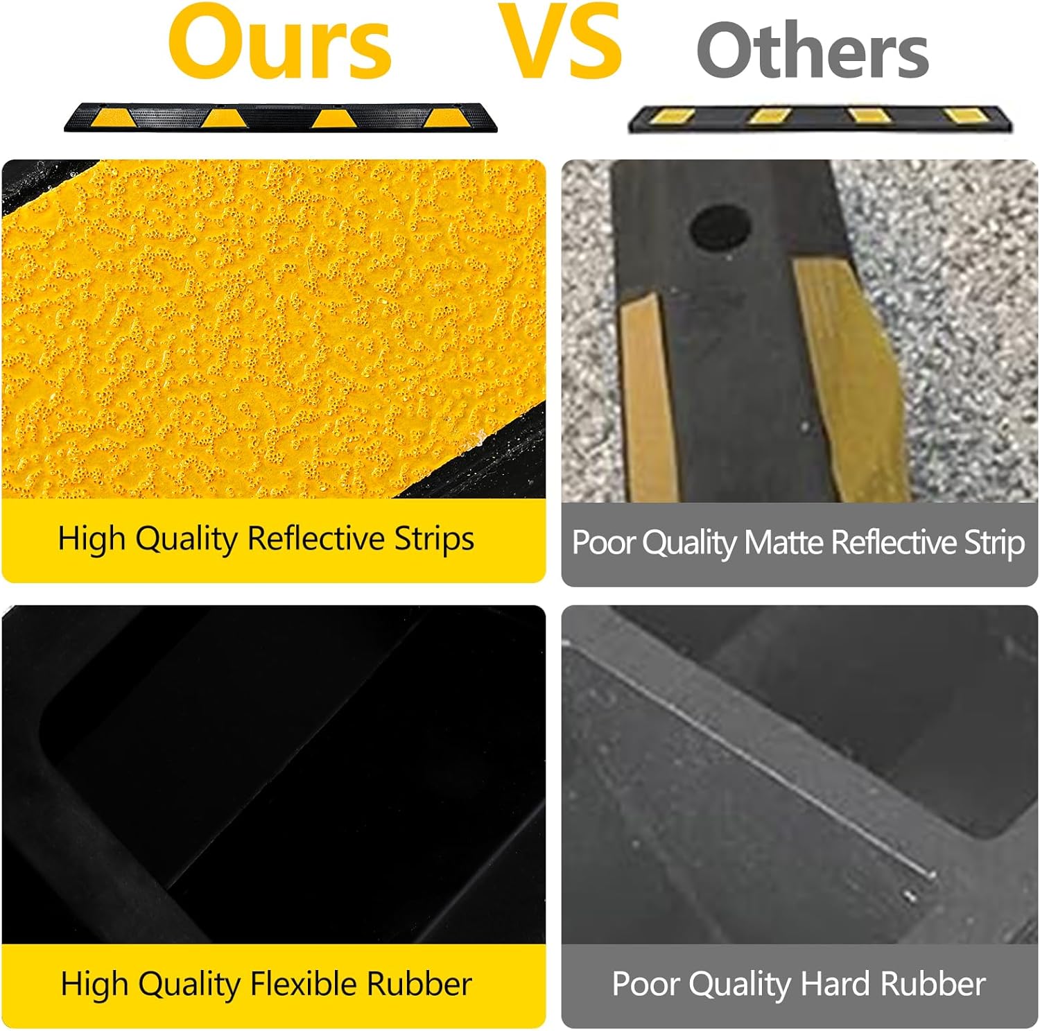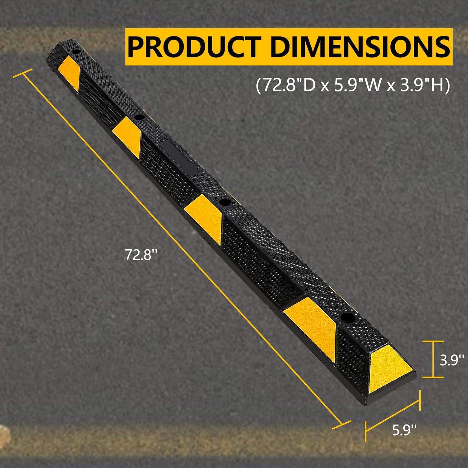 - EASY INSTALLATION: Equipped with integrated mounting holes, these car stoppers can be easily installed permanently. The bright yellow reflective safety strips enhance visibility, making parking easier and safer, especially at night.