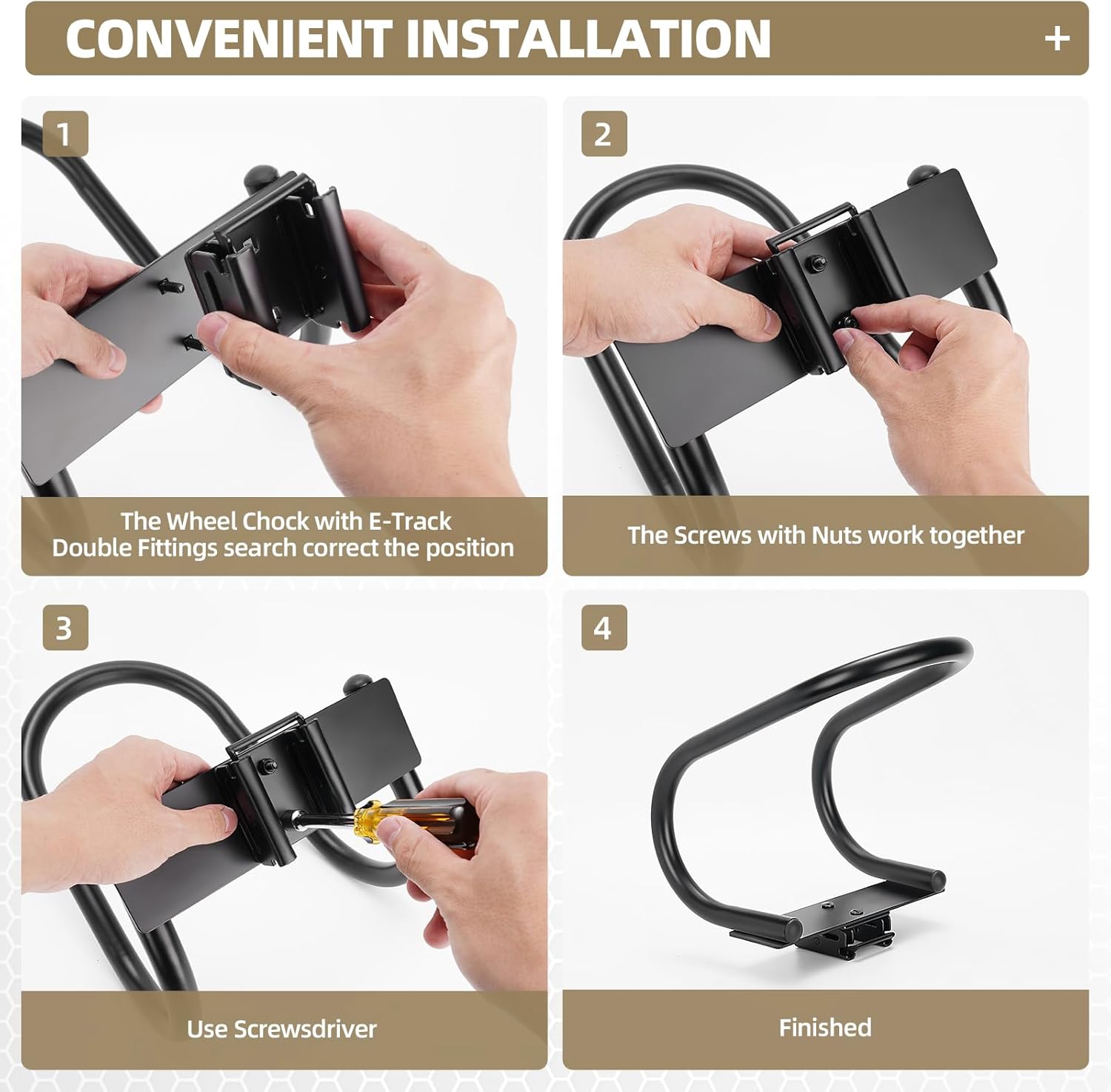 - Package Included:4 Pcs E-Track Wheel Chock, 4 Pcs Chock E-track mounts, 16 Pcs Screws and Nuts, 1 Pcs Screwdriver