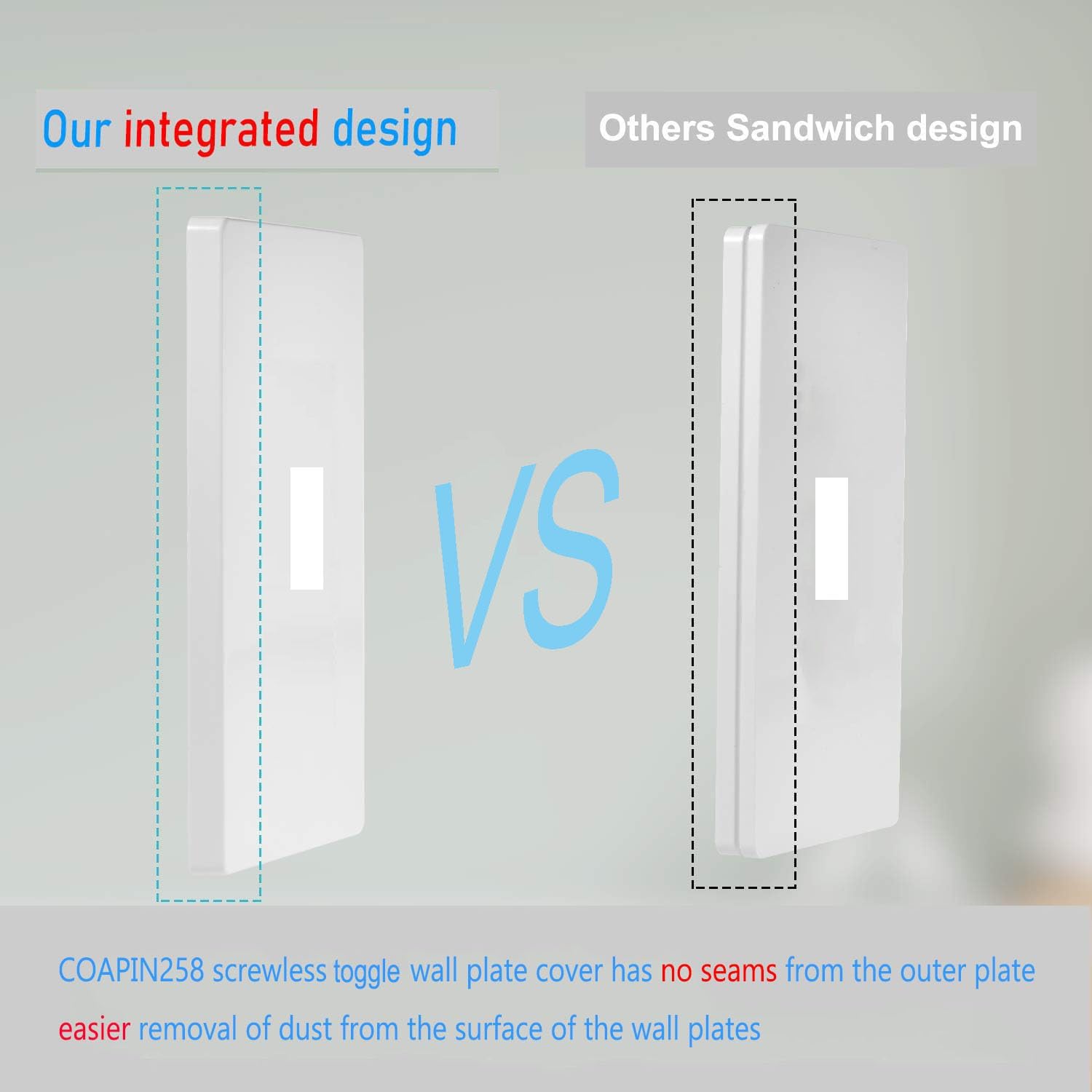 - 【Safe and High Quality】COAPIN258 Toggle wall plate cover is no visible screw design for child safety. Fire resistant material with no fire hazard. Switch Outlet cover is made of durable unbreakable polycarbonate thermoplastic, blank outlet cover is flexible and resilient which can withstand bends, twists, hard impacts and heavy force, light switch cover plate heat resistant to temperatures over 100°F to protect against discoloration and fading over time.