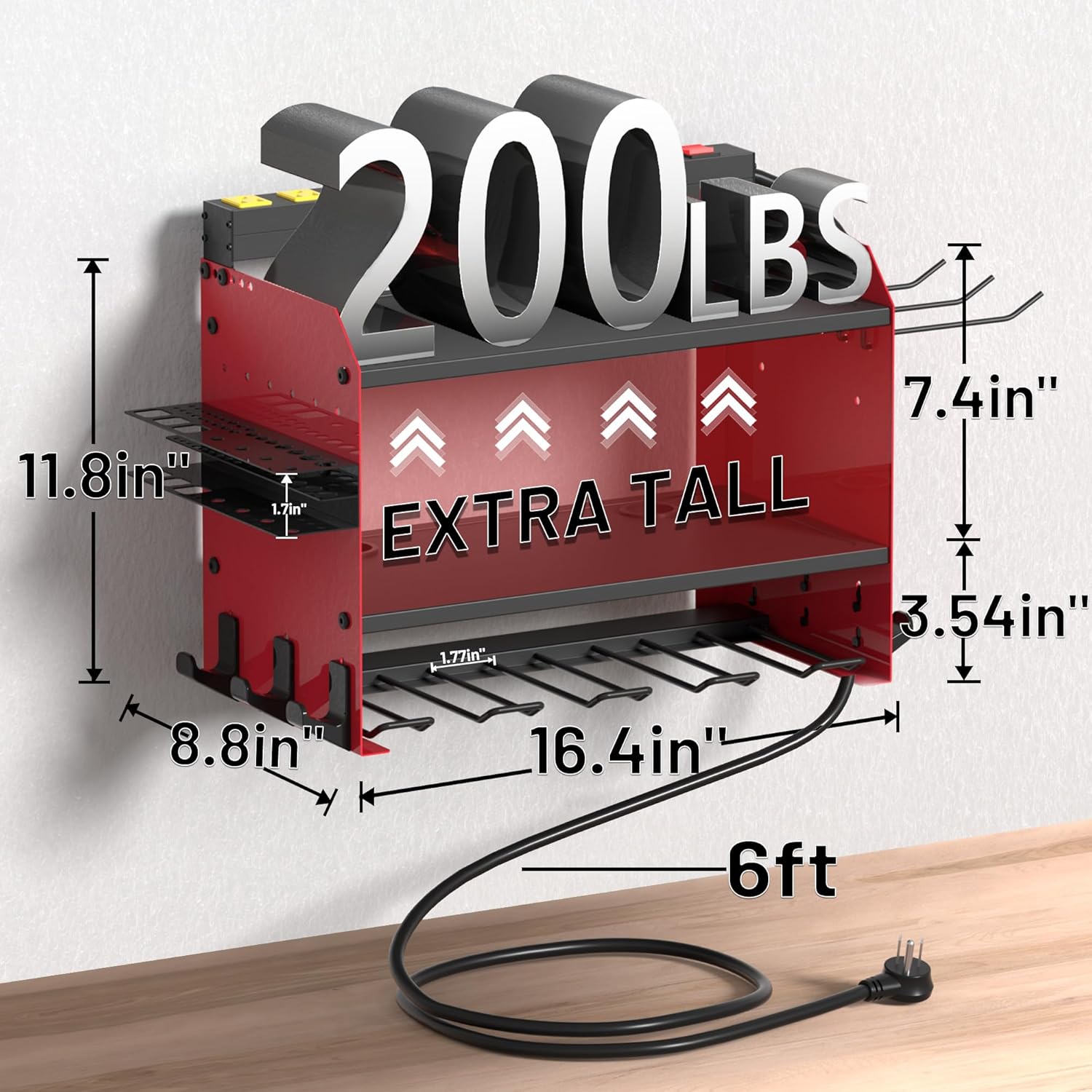 - TOOL CHARGING STATION:8 outlets power strip for power tool organizer solves the power needs,with 125V/15A/1875W,6ft power cord and 2100J surge protection to protect power equipment;Drill holes in single-layer boards to solve power cord clutter problems