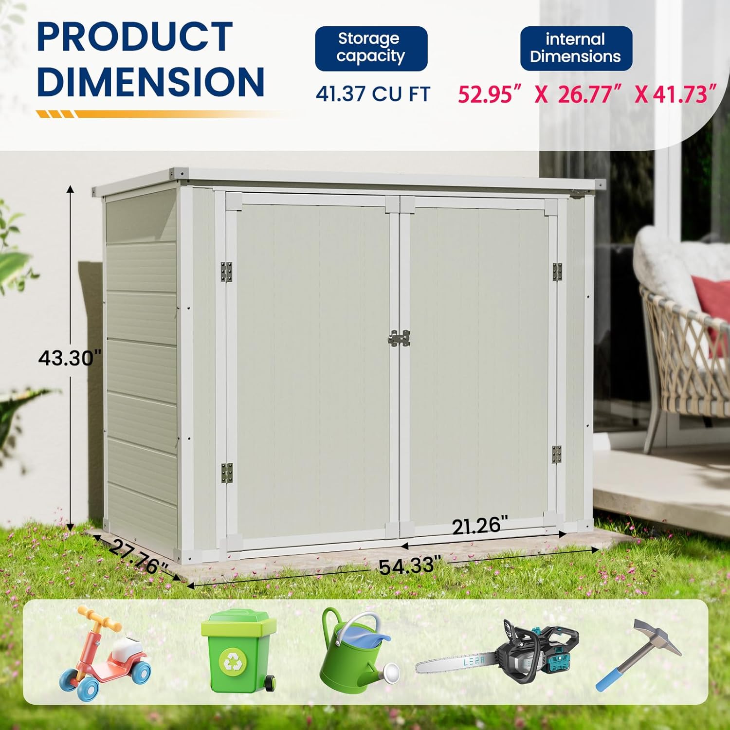 - 【LARGE STORAGE SPACE】 This plastic storage shed has a capacity of 41.37 cu ft; Exterior is sized 55.9"L*29.53"W*43.31"H, and the interior measures 52.95"L*26.77" W* 41.73" H; A beautiful storage cabinet perfect for storing your two trash cans, gardening tools, yard supplies, sporting goods and more.