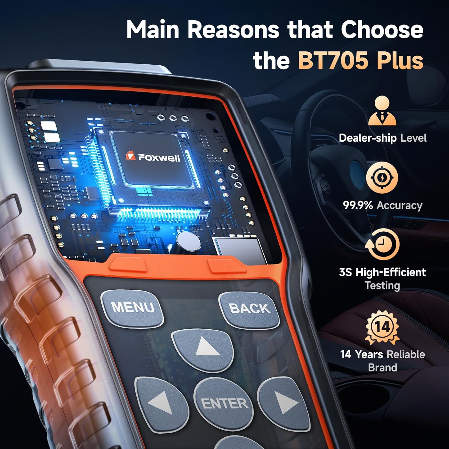 - Ever been stranded by a dead battery? It’s more than an inconvenience — towing costs, lost wages, and that sinking feeling when the key does nothing. The BT705 Plus Car Battery Tester keeps you in control, checking 12V/24V lead‑acid batteries (1000–2000 CCA) before failure. It measures battery health (SOH) and charge (SOC), tests starting systems (voltage/time/CCA) to prevent cold‑start failures, and checks charging systems (no‑load voltage/load voltage/ripple peaks) to detect alternator and regulator issues. Drive with peace of mind—this battery diagnostic tool saves time, money, and unexpected breakdown stress