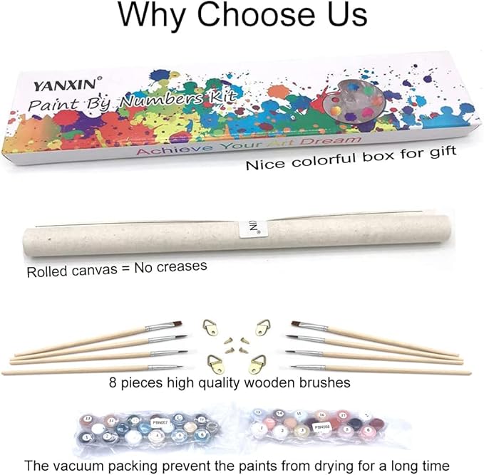 - Why choose us:colorful box,rolled painting canvas,8 paint brushes,30% extra paints
