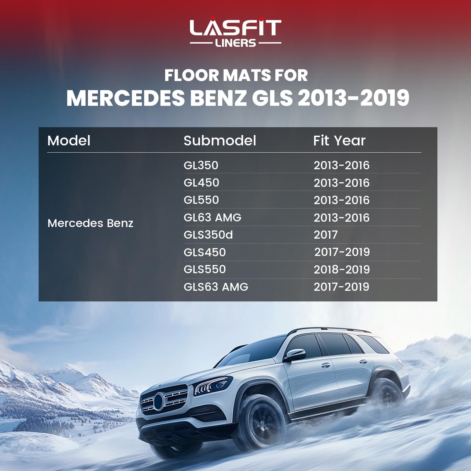 - Custom Fit : State-of-the-art 3D laser scanning technology ensures the perfect custom fit for Mercedes Benz GLS350d / GLS450 / GLS550 / GLS63 AMG 2019 2018 2017 & GL350 / GL450 / GL550 / GL63 AMG 2016 2015 2014 2013 with full coverage. LASFIT floor mats are precisely tailored for vehicle-specific floor carpets. Includes the 1st & 2nd row floor mats.