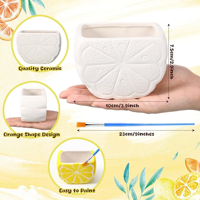 - Sufficient Quantity: you will receive 6 sets of DIY ceramic fruit orange planters paint craft kit, includes 6 pieces of unpainted cute flowerpots, 12 colors of mini acrylic paints, 2 pieces of paint brushes and 1 piece of palette, enough in quantity everything you need to unleash your inner artist