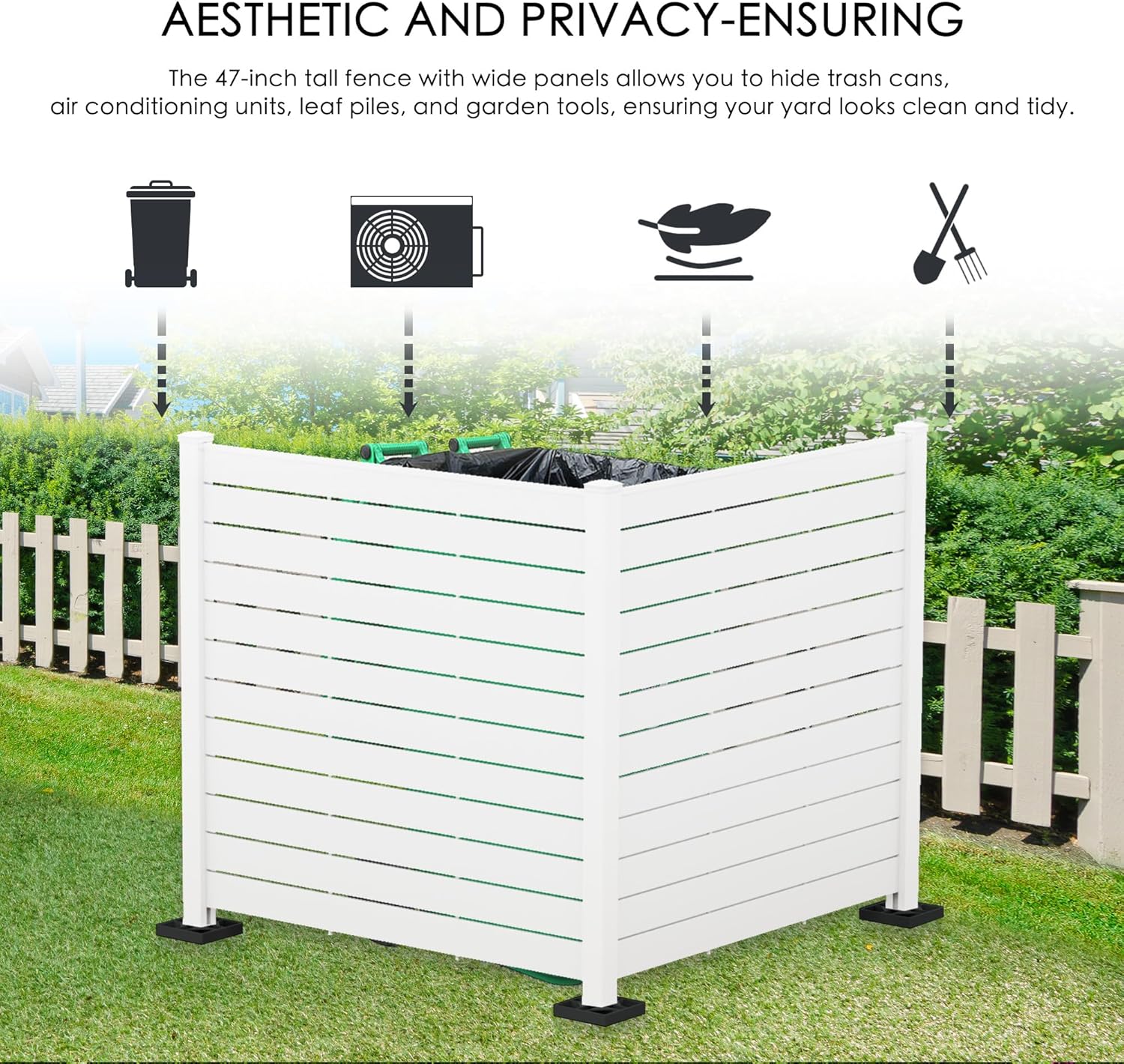 - š” Privacy Ensuring: Standing at 48 inches tall with wide panels, this fence effectively hides trash cans, air conditioning units, leaf piles, and garden tools, keeping unsightly items out of sight and ensuring your yard looks clean and tidy.