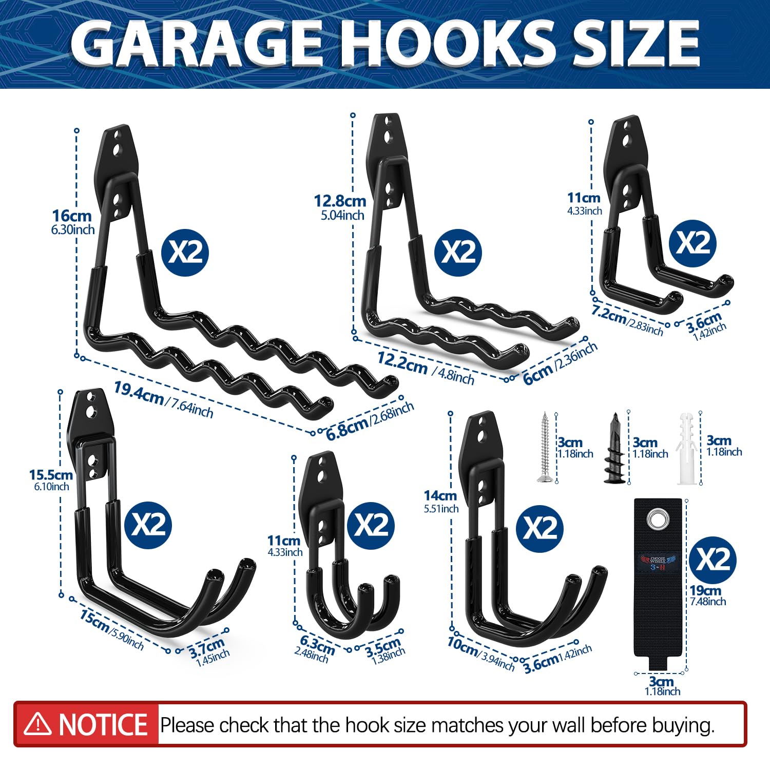 - Hanging Hooks Heavy Duty Bulk Set: 2 large size extension cord organizers and 12pcs wall hooks heavy duty in 6 different sizes:2 large wave bike hooks for garage,2 medium wave ladder hooks for garage wall, 2 small U type wall hangers, 2 large J type garage organization hooks, 2 medium J type wall mounted hooks,2 small J type tool hangers. All the screws and anchors included, multi-functions in one set of tool hangers for garage wall