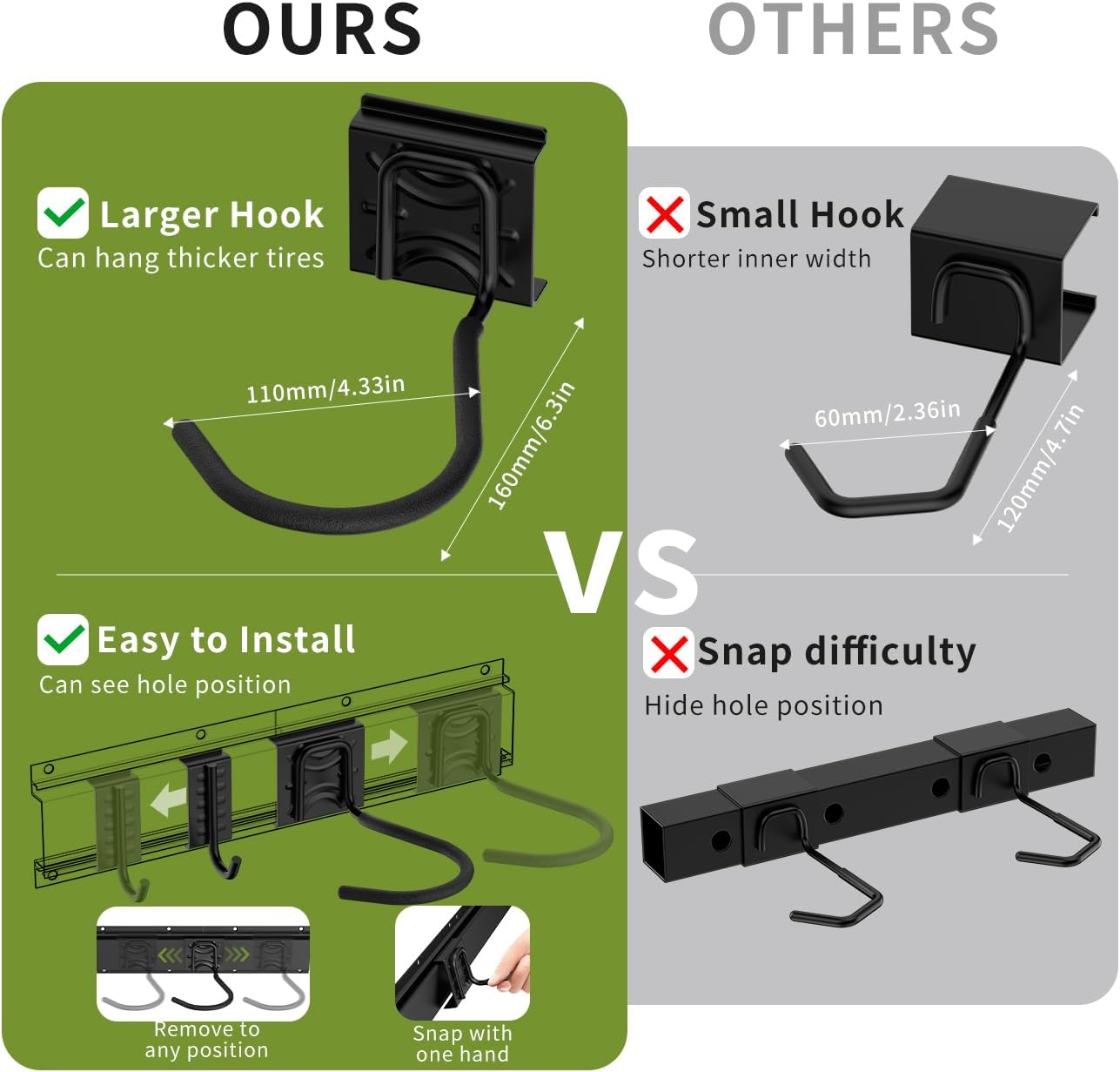 - 【Upgraded Large J-Hooks】 The oversize 3*6.3*4.3in(75*160*110mm)can support up to 75 lbs per hook and accommodate tires up to 5 inches(12.7cm) wide - much larger than standard 2/3 sized hooks. The sturdy steel construction with rubber coating protects your bikes from scratches and sliding. Perfect for organizing your garage or basement, but not recommended for heavy e-bikes.