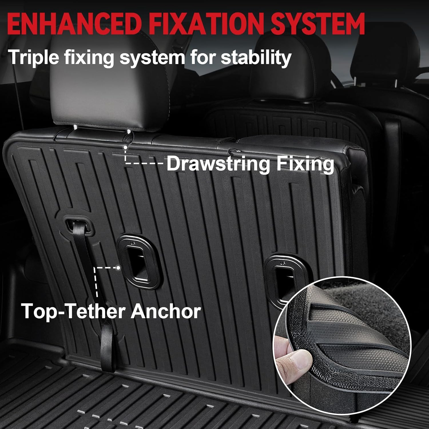 - Triplex Fixation: The backrest mat covers hook-and-loop to grip securely to the seat back. Attached drawstring and top tether protectors reinforce seatback installation