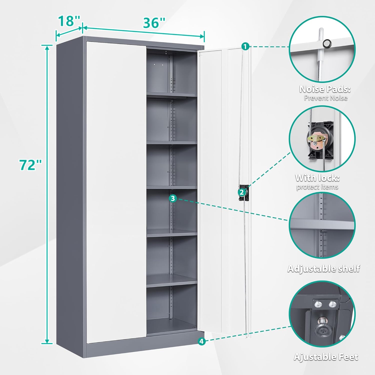 Wide & Deep Metal Storage Cabinet with 6 Shelves,72 inch Tall Garage Storage Cabinet with Lock,Gray White Metal Cabinets with Locking Doors,Large Steel Lockable Cabinets for Home,Office,Shop,Garage