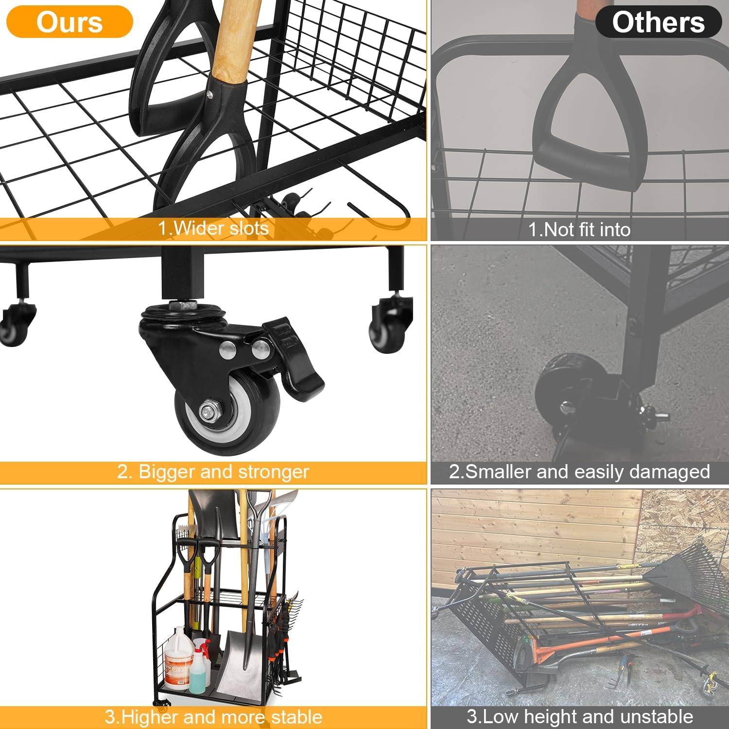 - 【Multiple Occasions】This garage tool organizer is suitable for a wide range of tools including garden tools, farm tools and cleaning tools such as D-handle tools, rakes, shovels, brooms, mops, pruning sticks and more.In addition, this 3-tier design garden tool storage is suitable for a variety of indoor and outdoor occasions, which can effectively organize tools in your garden, shed, garage, patio, basement or lawn, making your garage storage and garden storage a breeze.