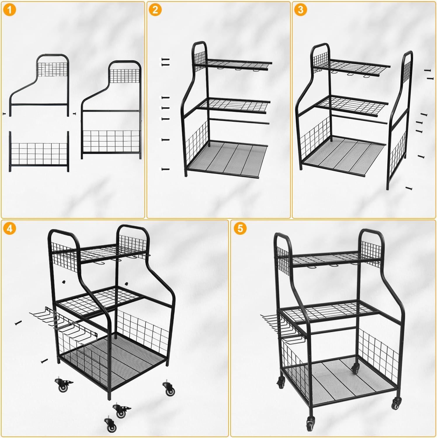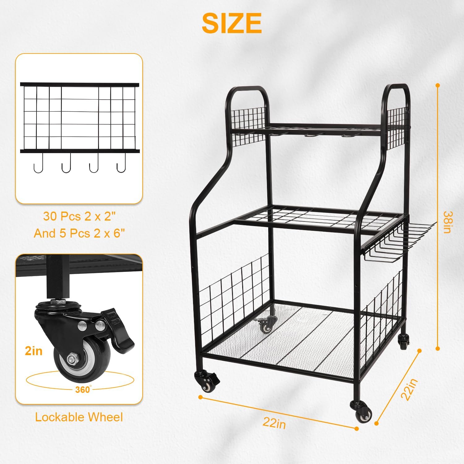 - 【Practical Design】 The front of this garden tool organizer comes with 4 pcs"G" hooks for hanging D-grip tools and power tools. The sides have 10 tool hanger hooks for hanging small tools. In addition, this garden tool holder comes with four high-quality heavy-duty wheels, which are larger than those on regular tool racks, allowing you to easily move it from indoors to outdoors and glide it around even in deep grass. Save you a lot of time and improve your work efficiency.