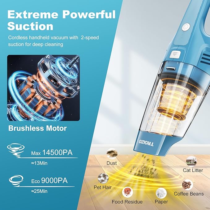 - Strong Suction for Deep Cleaning: equipped with high-speed brushless motor, this hand vacuum delivers superb suction power of 14500PA, which can efficiently eliminates pet hair, dust, debris, crumbs from car, office and home. The portable vacuum has two adjustable speeds for you to tackle daily cleaning swift and effortless with incredible deep-cleaning performance, it is a good helper for you to make your environment look new in a second and enjoy a more comfortable life.