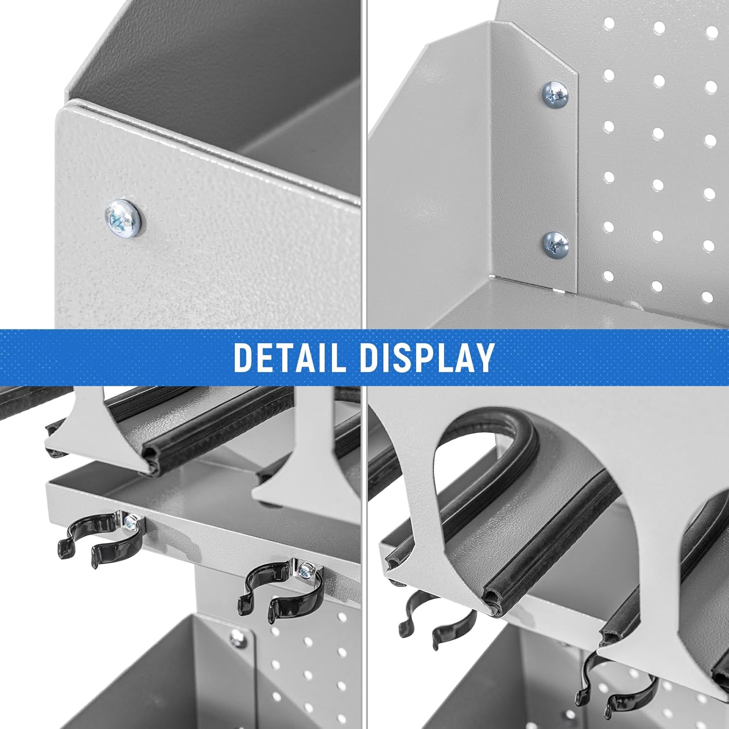 - Power tool rack equipped with U-shaped rubber strips provide a effective protective for the tool and decrease cushion vibrations. The extra pipe clamps can firmly clamp the hold power tool handles to ensure safety and stability