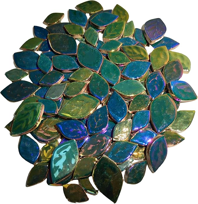 1.1LB Iridescent Leaves Ceramics Mosaic Tiles,Making Creative 3 Size Ceramic Mosaic Pieces for DIY Craft,Flowerpots,Vases,Cups,Garden Decor Mosaic Making Supplies (Peacock Green)