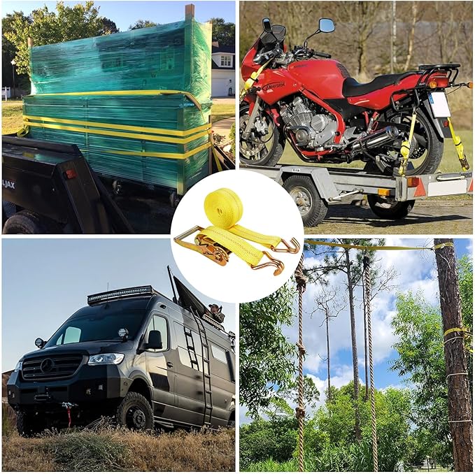 - 【Durable and Sturdy】Ratchet tie down straps heavy duty is made of metal steel and high density weaving of high quality polyester webbing fiber, features wear-resistance, corrosion-resistance, won't curl and superior breaking resistance. Super soft, does not hurt the goods. Release mechanism adpot steel heat treatment, has high hardness, not easy to rust and bend.