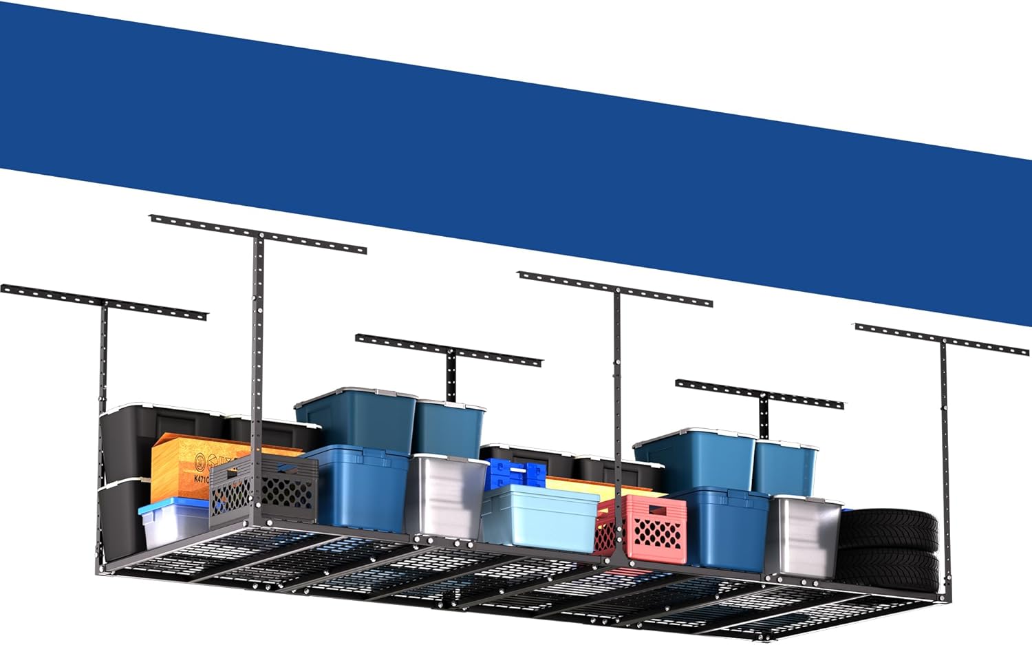 - MATERIALS & CRAFTSMANSHIP: Thickened carbon steel frame, dense grid with a spacing of 2.1 inches, thickened 8mm screws, rigorous full welding process, and precise laser cutting. The waterproof and rust-proof powder coating enables the garage rack to be used for a long time.