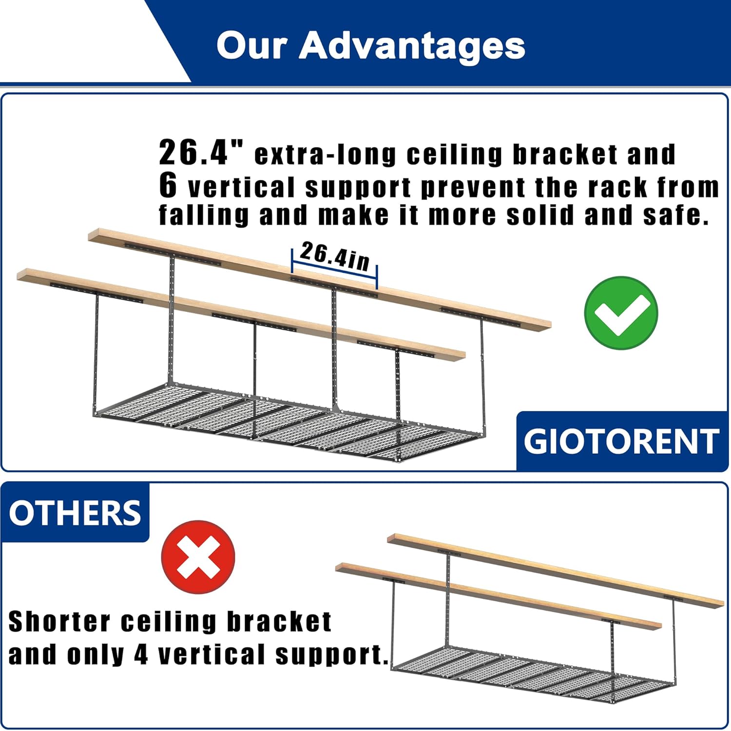 - EASY TO ASSEMBLY: Please refer to the instruction manual and install it step by step. According to the spatial characteristics of your garage, freely adjust the direction and height. Note: This ceiling storage rack is suitable for ceilings with joist spacing less than 24 inches. If the joist spacing is greater than 24 inches, it is only suitable for ceiling spacing of 48 inches.