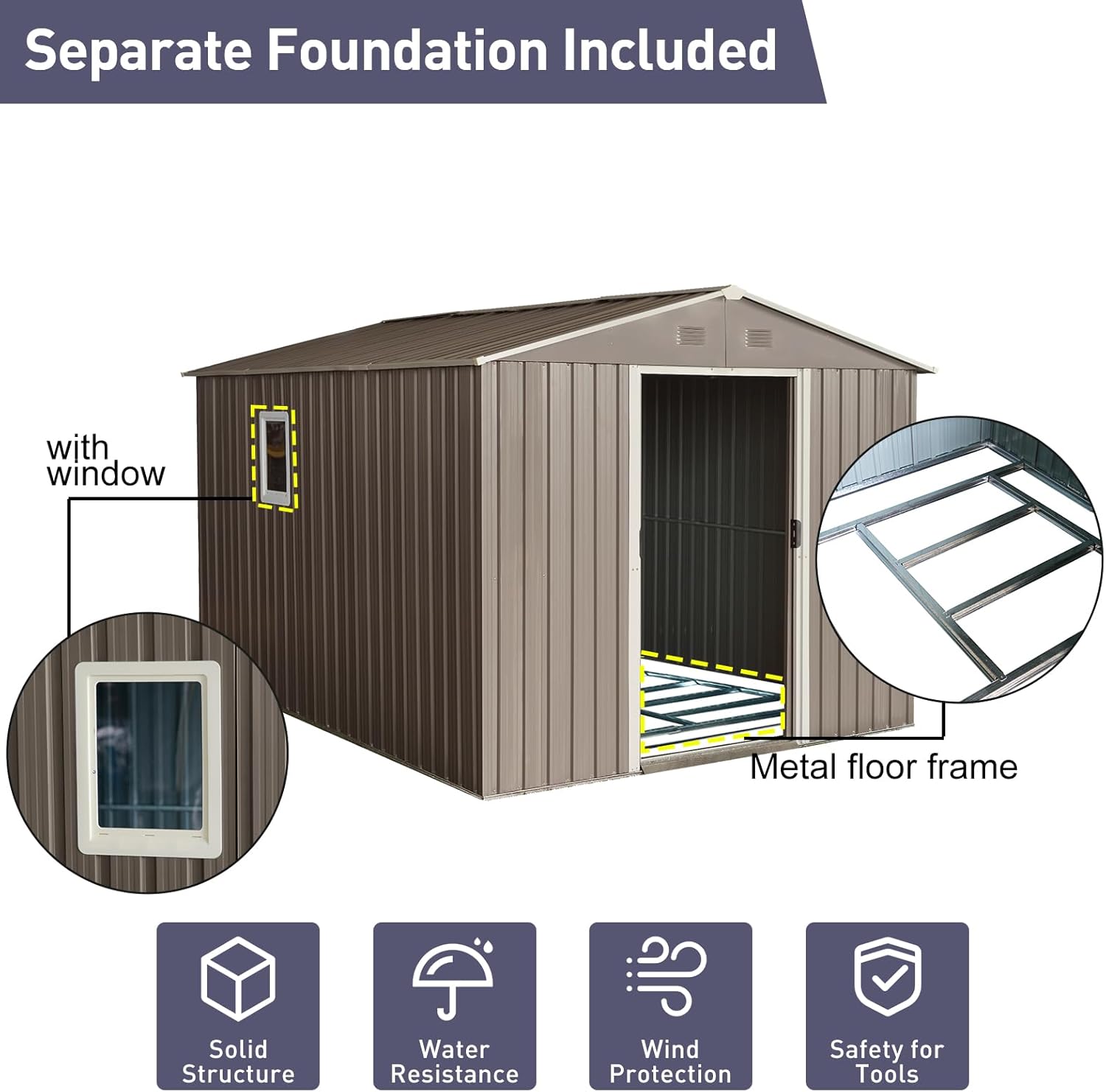 10×8FT Outdoor Metal Storage Shed Large Garden Sheds with Floor Base & Window,Sliding Doors and Padlock for Garden,Backyard,Lawn,Easy to Assemble,Grey
