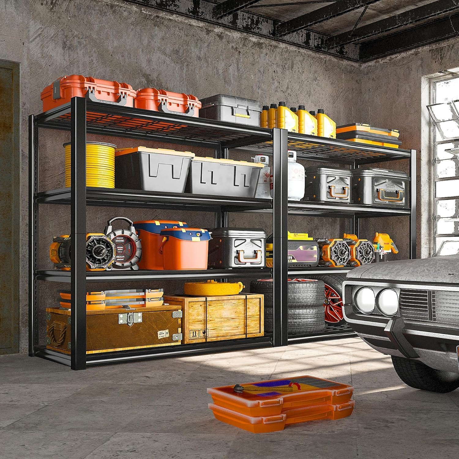 - ă2200LBS Capacity Garage Shelving Heavy DutyăMade of heavy duty metal, this 4-tier storage shelves holds 550 lbs each tier and 2200 lbs in total, perfect for loading heavy items like tires, garage gears, cans, jars and etc. Differ from wood boards, shelves from REIBII garage storage shelving will not break or fall apart, with no chemical material used, this metal shelving stay durable and sturdy as well
