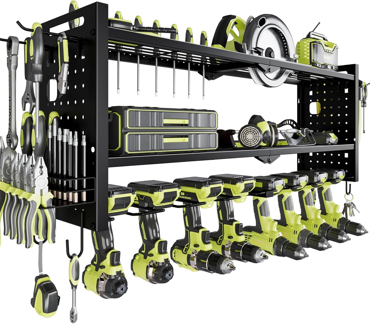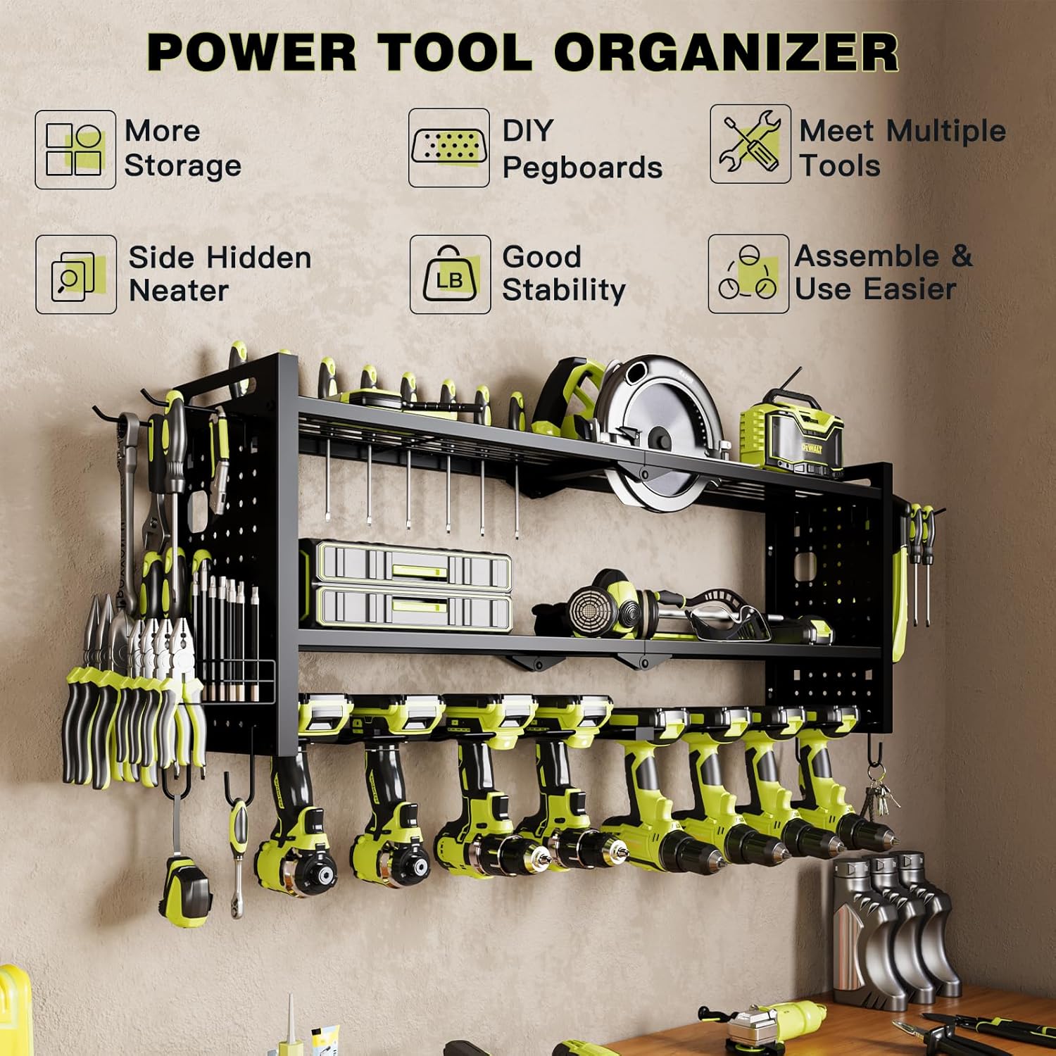 - Large Capacity:With 7.5 inches of spacing between the shelves, our wall-mounted tool organizer offers ample storage space that not only makes it easier to access your tools but also accommodates a wider variety of tool types