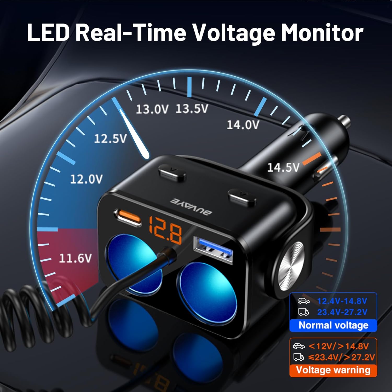 - 【Larger LED Display and Voltage Monitor】Large LED high-definition digital display screen monitors, can more accurately monitor 3 voltages in real time - 1x car battery voltage and 2 x USB-A charging voltage. Intelligent real-time voltage detection and LED screen display, timely monitoring of your car battery, to avoid the situation of running out of power and so on. 12V voltage normal range: 11.6V~14.8V; 24V voltage normal range: 23.1V~27.3V.