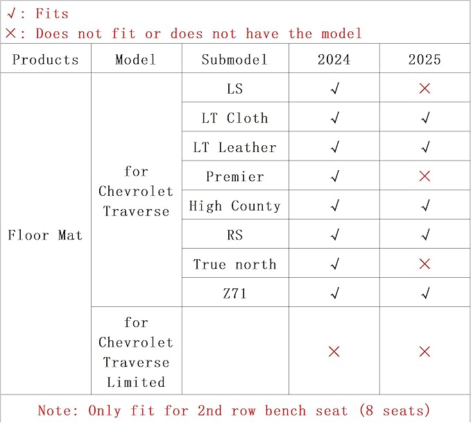 - 🚗FITS LIKE A GLOVE:Perfect fit for chevy traverse 8 seat 2024 2025 not for limited. Auxko floor mats are high-precision laser measured, meaning our custom fit will offer optimal coverage and look as if the mats came with your chevy traverse 8 seat 2024 2025. Auxko incorporates a specially designed retention system and non-slip nibs on the mats to keep them locked in place.