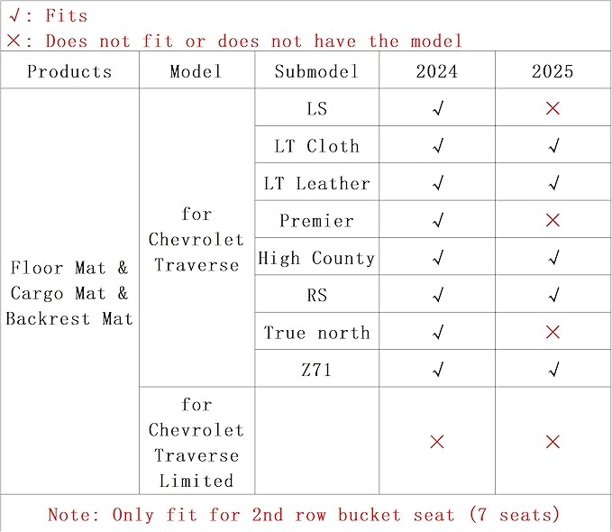 - Material Thermoplastic Elastomer (TPE) : Vehicle Service Type 2025 2026 Buick Enclave, GMC acadia 7 seat 2024 2025 2026, chevy traverse 7 seat 2024 2025 2026 2025 2026 Buick Enclave, GMC acadia 7 seat 2024 2025 2026, chevy traverse 7 seat 2024 2025 2026 See more