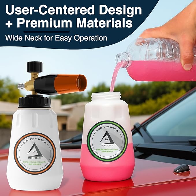 - Wide-Mouth Bottle Design: The large 1 Liter capacity container reduces the need for frequent refills. The wide mouth foam cannon design makes pouring soap into the spray foam cannon easy and mess-free, while reinforced walls prevent cracks and leaks