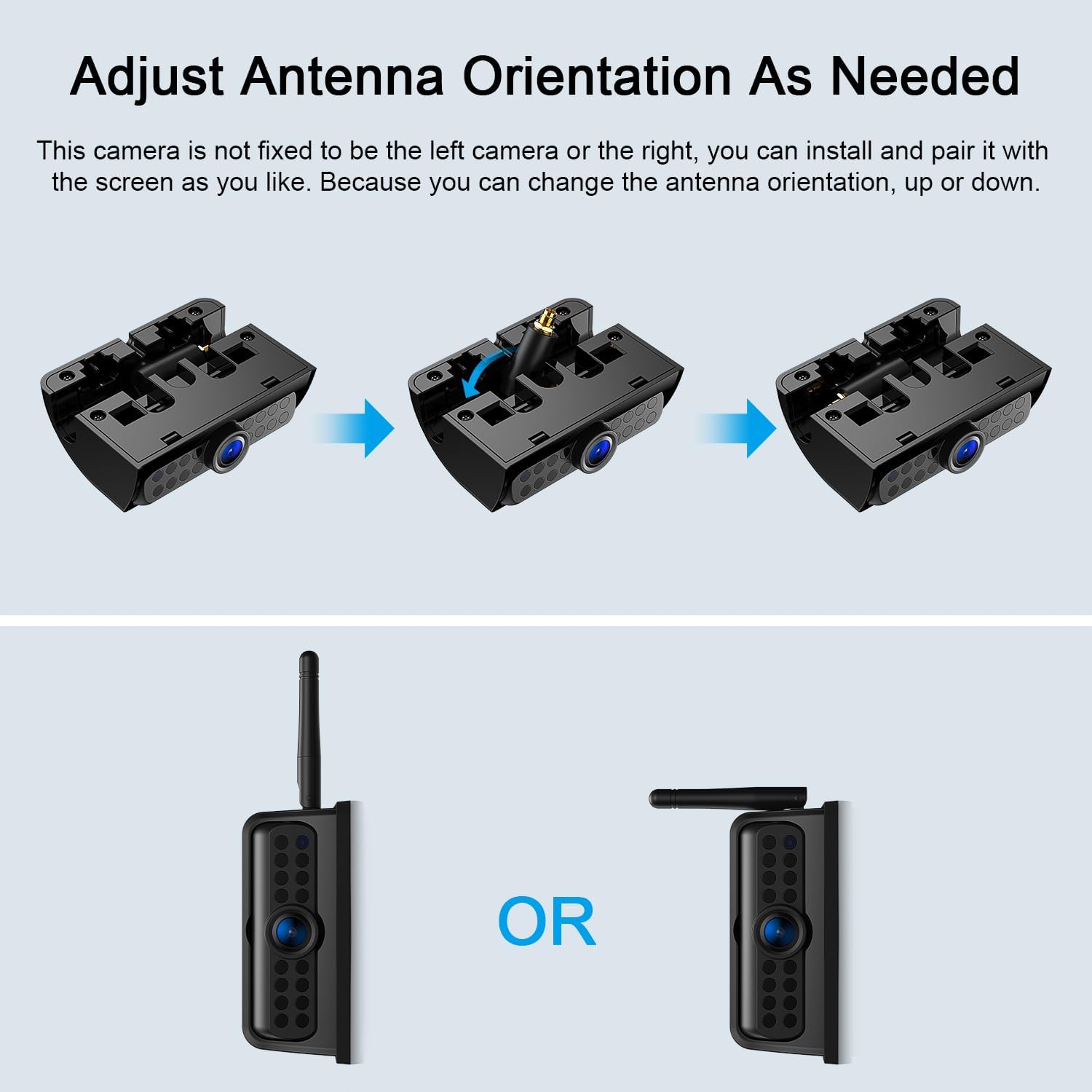 - Not fixed as a left-view or right-view camera, you can go ahead and adjust the antenna to face up or down as needed, as well as make the antenna vertical or folded.
