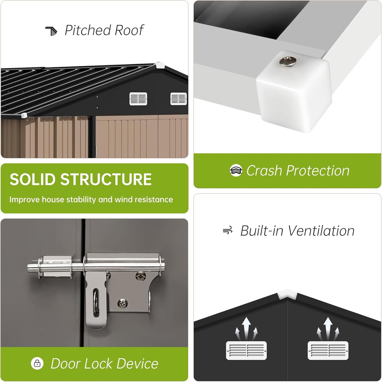 - 【Secure Lockable Door Design】The tool shed outdoor storage features 2 large doors, each measuring 47.24 in x 63 in, allowing you to easily roll in equipment such as lawn mowers. The lockable door design (lock not included) enables you to protect your belongings securely.