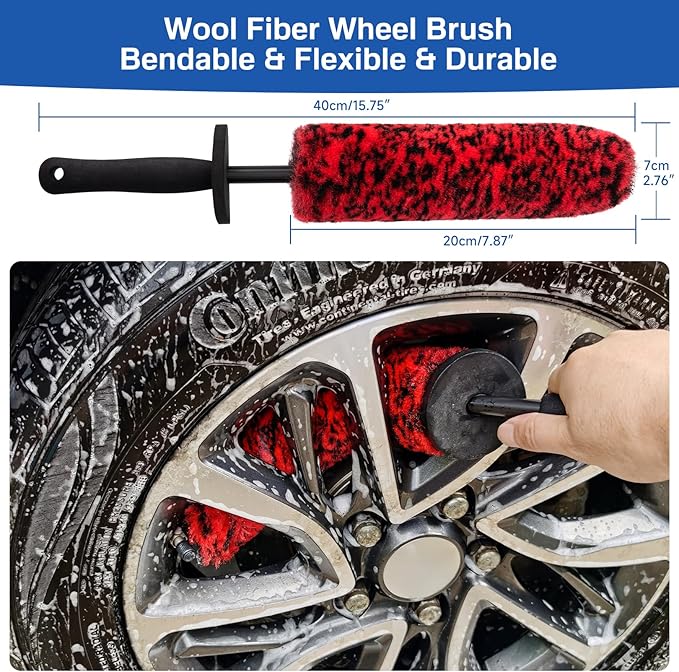 - AMAZING CLEANING EFFECT:Our car wheel cleaning brushes can be bent 360 degrees for deep cleaning, combined with detail brush and stiff tire brush to penetrate into small crevices, bolts, hubcaps, and other intricate wheel details, ensuring comprehensive cleaning. In addition, our wheel cleaner brush is equipped with very thick and soft synthetic wool fibers,which can hold tons of cleaning liquids and foam, quickly and easily wash away dirt on wheels