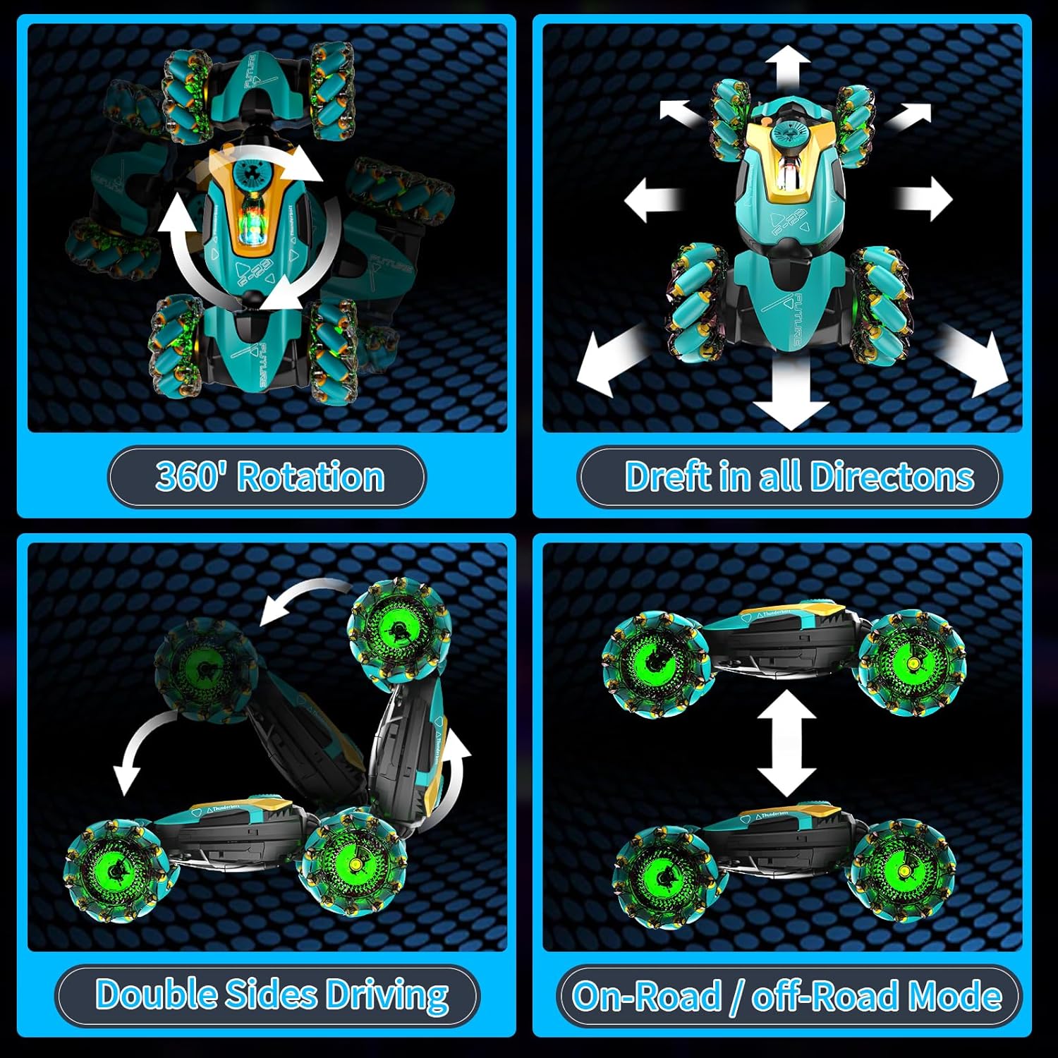 - Dual Controls: It's an exciting and interactive way to play with the car toys,Awesome Boys Toys 4-6-12,child the power to control the action with just a wave of their hand;The innovative 2.4 G gesture-sensing technology and Multi-function remote control handle allows them to master the stunt car’s impressive moves,engaging play experience,Great remote control car for boys 4-7-12