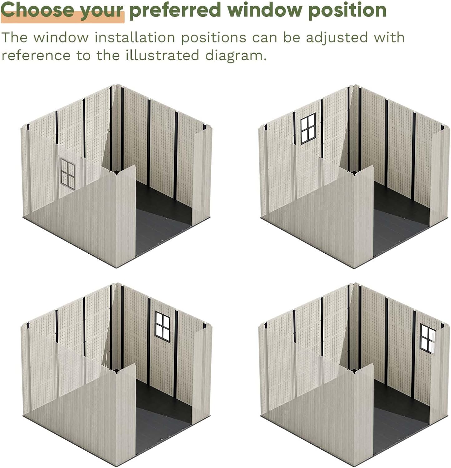 - Two Windows Design: Allows natural light to illuminate the interior, reducing the need for additional lighting; Provides a pleasant view of the surroundings; Enhances security by allowing visibility of the shed's contents. And the position of the window can be adjusted according to your needs with the wall panel.