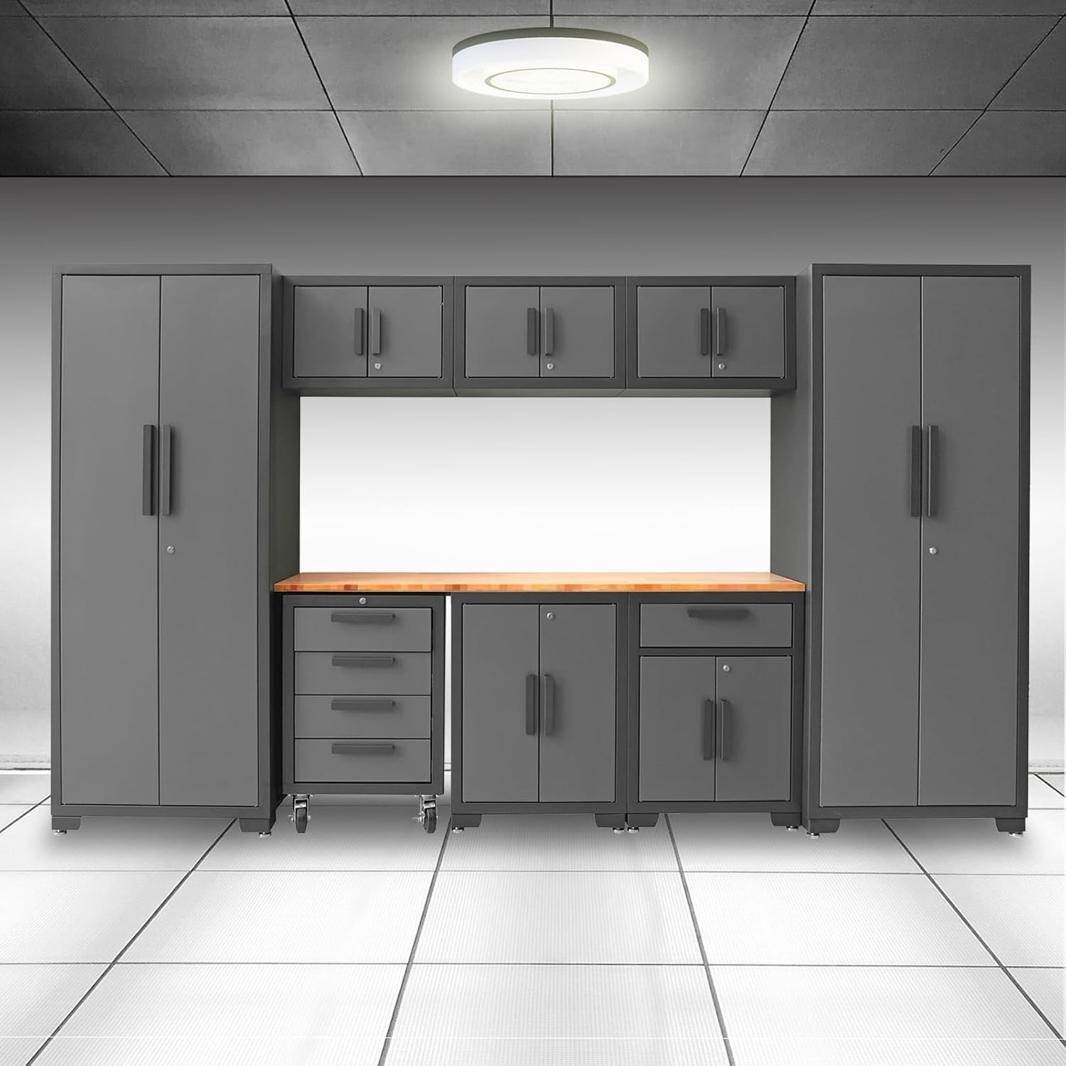 - This garage storage cabinet is constructed with a scratch and stain resistant powder coated finish steel. Equipped with a 1" thick wood worktop which is convenient to operate most tools. The countertop support plate is installed on the side of the tall cabinet to support one end