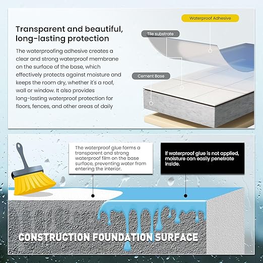 - EASY TO USE: The transparent waterproof adhesive can be used both indoors and outdoors, making it easy to apply and repair. Use a brush to evenly apply the sealant on surfaces such as tiles, cement, and more. After the sealant is fully dry, apply second coat. It is recommended to apply 2-3 coats to enhance the effect. After multiple applications, wait 24-48 hours to ensure it is completely dry.
