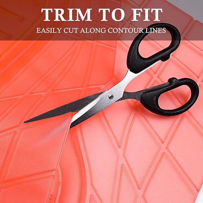 - Trimmable & Universal Fit: There are cuttable lines on the sides of mats, which can be modified according to your vehicle size for a perfect fit. Fast and easy to install in most cars, trucks and SUVs. Thick, heavy duty mats & Liners. Flexible for floor contours and tough for all weather conditions.