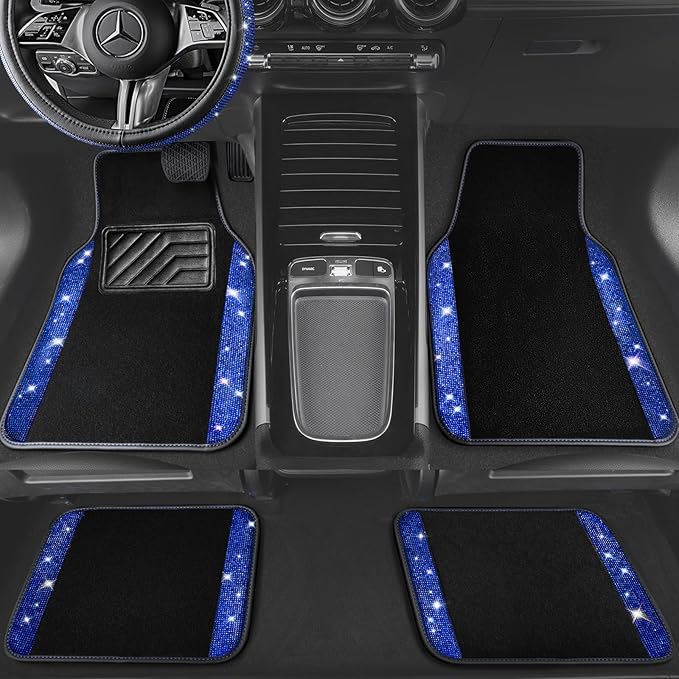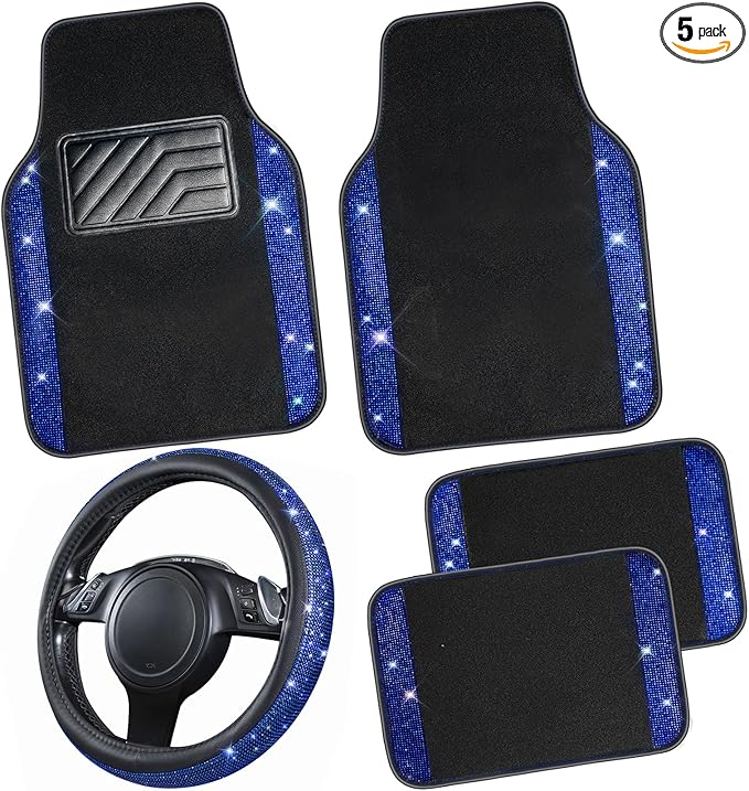 - BLING DIAMOND GLITTER CRYSTAL - Car mats full set and steering wheel cover 5pcs. Premium carpet with pretty rhinestones made. The waterproof floor mat protects your car from, scratches, cold, moisture, wear and dirt. The steering wheel cover made of diamond and premium Microfiber leather. Diamonds will not fall off, providing long-term protection for your car interior