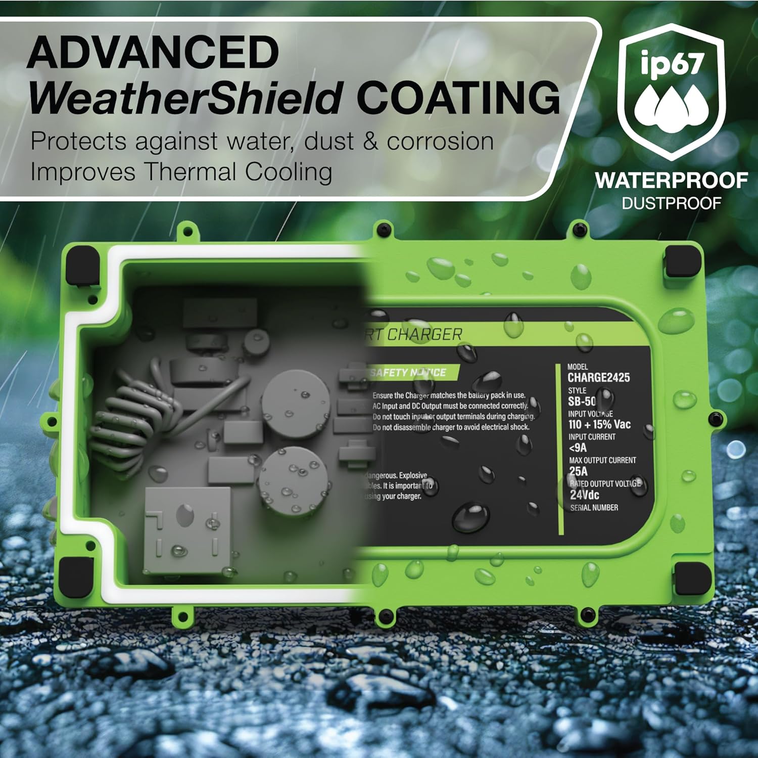 - ADVANCED WeatherShield WATERPROOF COATING - Protect your investment with our state-of-the-art WeatherShield Internal Coating, designed to safeguard the electrical components of your equipment charger from harsh weather conditions. Our charger is equipped with a rugged cooling fan and boasts an IP67 waterproof rating, ensuring durability and reliable performance in any environment.