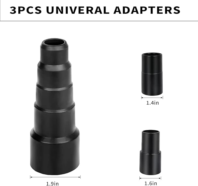 - Compatible with All Shop Vacuums: 3 diverse adapters are included to accommodate a wide range of vacuum hoses.Adapter A fits hoses with 1 1/4"(32mm) ID and 1 1/2"(38mm) OD, while Adapter B for 40mm ID and 48mm OD hoses. The 5-tier adapter fits hoses with IDs of 1", 1 1/4", 1 3/8", 1 1/2" and 1 7/8".
