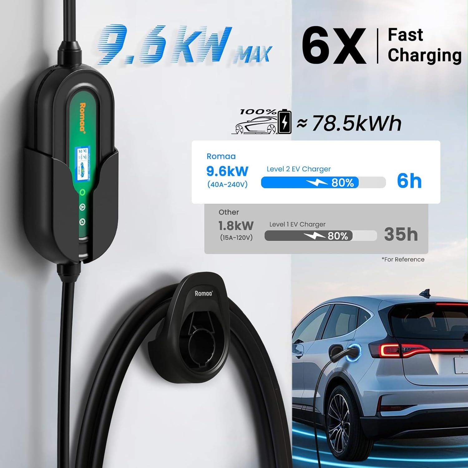 Romaa Level 2 EV Charger Portable Level 2 with 40A, 240V, NEMA 14-50, 25ft Cable, J1772 Charger, Adjustable Current, Delay Timer, EV Chargers for Home Level 2, App Control, FCC & ETL Certified