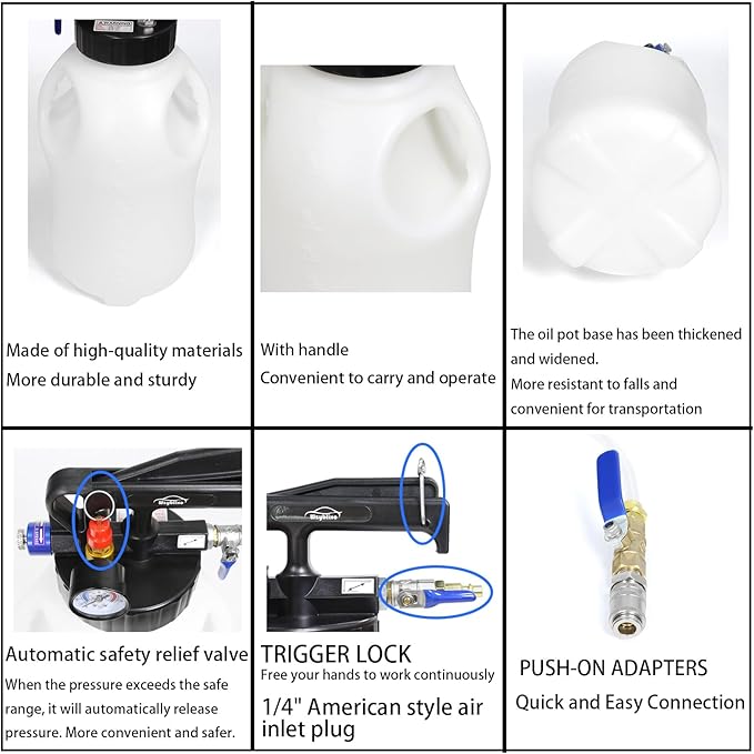 - 【Efficient and convenient】: This product is a 1.6 gallon pneumatic transmission fluid transfer pump that uses up to 170 psi of compressed air for extraction and 43 psi for distribution, generating strong suction and tight sealing, allowing you to quickly and easily handle flushing and replacement.