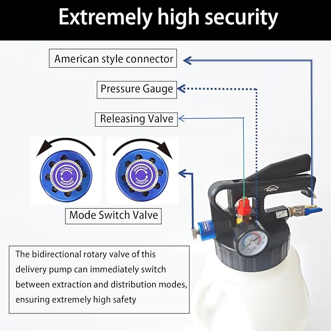 - 【Extremely high security】:The bidirectional rotary valve of this delivery pump can immediately switch between extraction and distribution modes, ensuring extremely high safety; Trigger lock allows hands-free continuous operation; When overpressure occurs, the safety valve automatically pops up, and the vacuum pump equipped with pressure monitoring instruments and a relief valve (preset 43PSI) to prevent overload eliminates any potential risks during operation.
