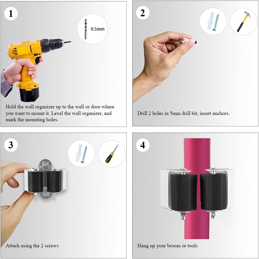- EASY TO USE: Because mop broom holder wall mounted is made of 0.7mm thick metal material instead of 0.5mm as most of the ones on the market, you don’t have to worry about deformation even if you use it indoors or outdoors for a long time.You can slide the broom in and out with one hand. Unlike plastic mop holders with spring-loaded rollers, this broom organizer wall mount has rubber rollers to hold the handles, allowing the handle to slide in from the front and be held firmly in place.