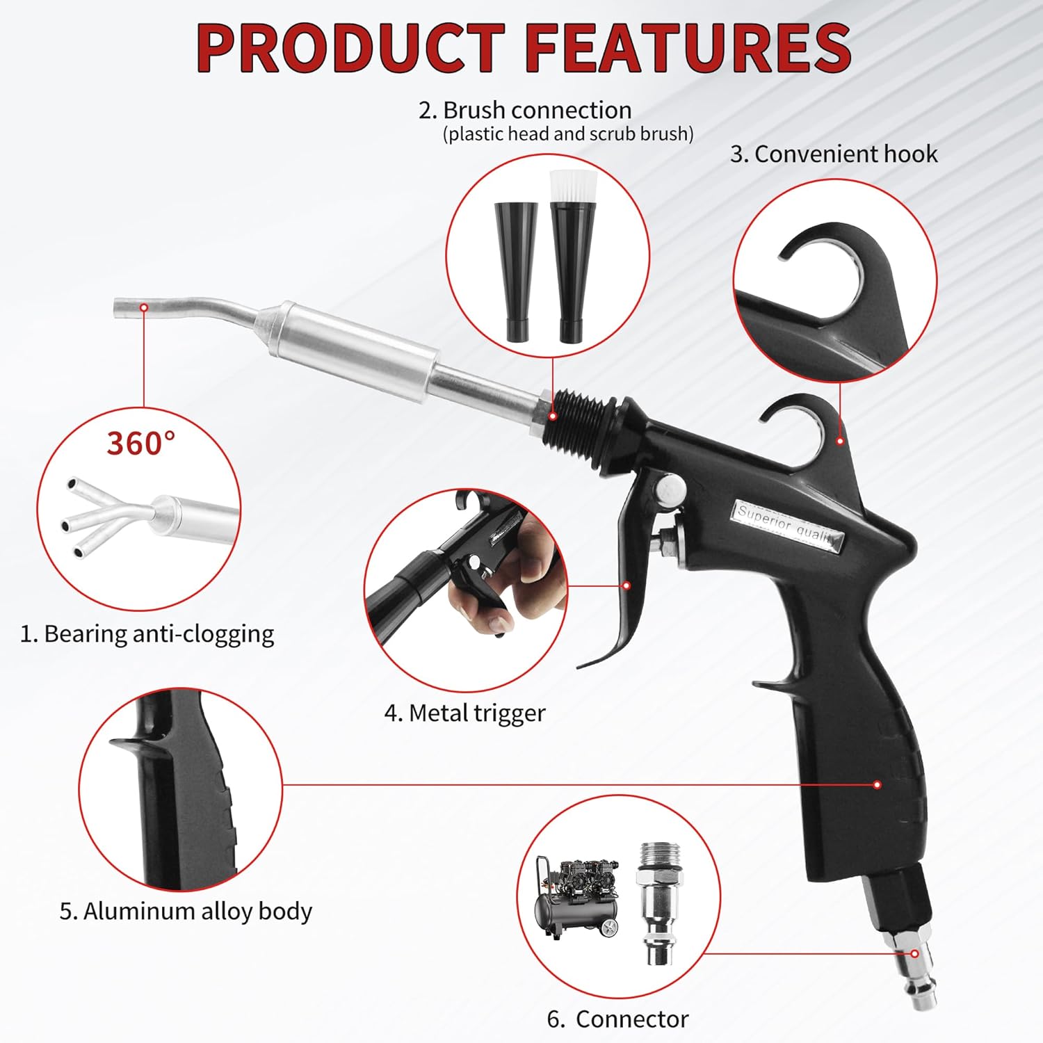 - Package Includes: 1pc x air blow gun;1pc x detail brush of 5 sizes;1pc x brush horn head;1pc x fiber cleaning cloth;1pc x USA connector for multi-scenario cleaning