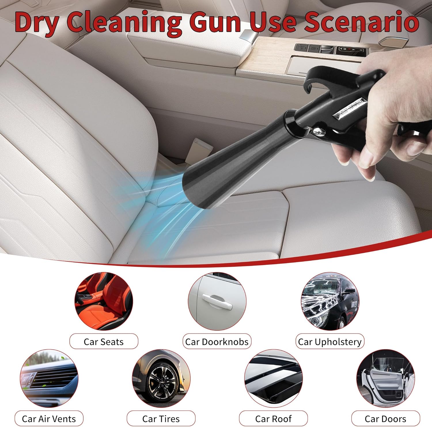 - Multifunction:Car cleaning gun can clean car surfaces quickly and efficiently,including seats,doorknobs,upholstery,air conditioning outlet,tires and roofs. In addition to removing dust and dirt,the dust gun can also quickly dry the moisture on the car