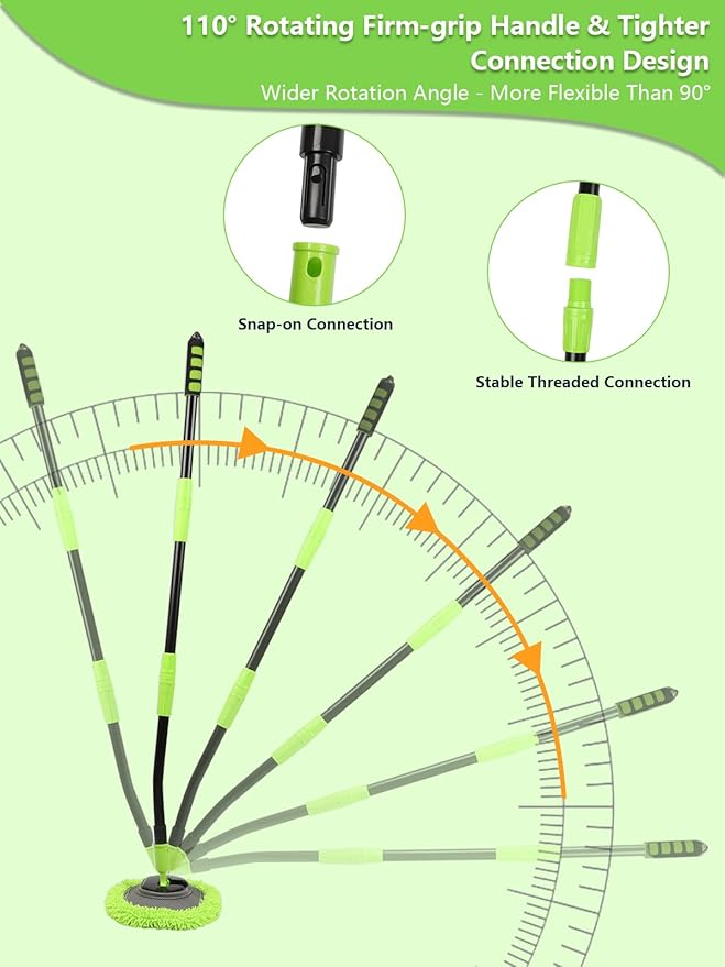 - 【Ergonomic Car Wash Brush with Long Handle: Lumbar Protection】 This 15° curved wash wand for SUV features a 110° rotating microfiber mop for car washing head, combined with optimally engineered length. Designed as a versatile car wash soap brush, it eliminates bending during roof/wheel cleaning while preventing lumbar strain. The car wash brush with long handle uses secure threaded connections for controlled force application during washing.(Package contains: 3 sections of car wash mop handle, 1 mop head.)
